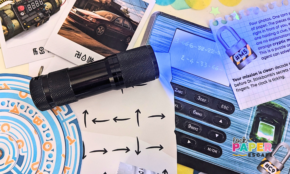 If you’re feeling extra creative, the hidden message can be coded itself. Two layers of mystery for the price of one. This works beautifully in spy, or secret-mission themed rooms. In the puzzle below I’ve written a coded message where numbers represent letters on a keypad using my UV.