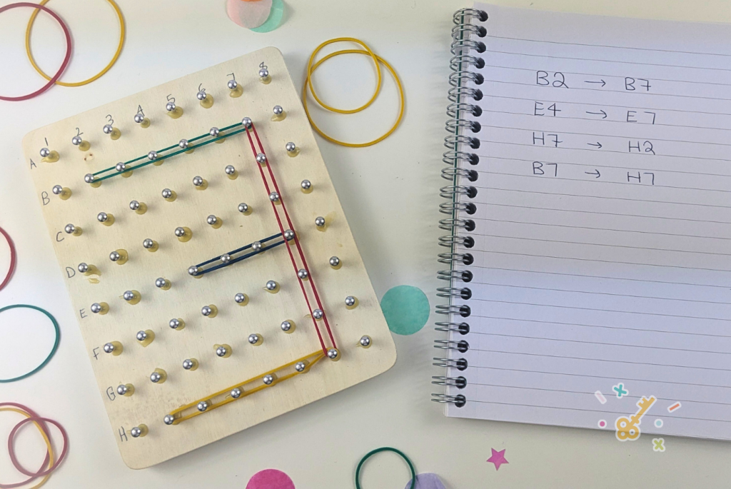 You can create letters and numbers using the elastic bands. If you wanted to make the activity more challenging write the coordinates on different pieces of paper and hide them around the room for players to find.