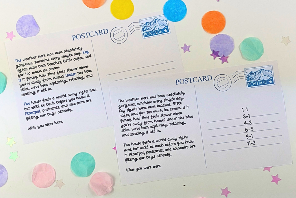 In the postcards above, the clue reads “the key is under the plantpot”. On the first envelope, words are written in blue, so easy to read. The second uses number coordinates. 1-1 is the first line first word, 3-1 is the third line first word, etc. Super simple, but takes a little longer to decipher.