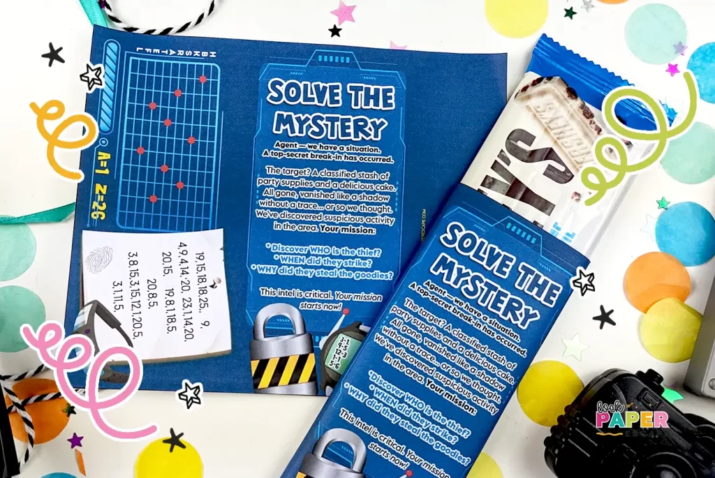 I think these are a fun addition to a party bag. Each bar becomes a tasty treat with a mini mystery to solve. On the front, kids will find a mini mystery puzzle where they have to work out who stole the cake, when it happened, and why. It’s a fun little challenge that keeps the escape room theme going when the kids get home.