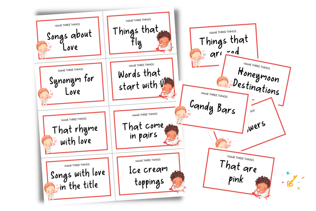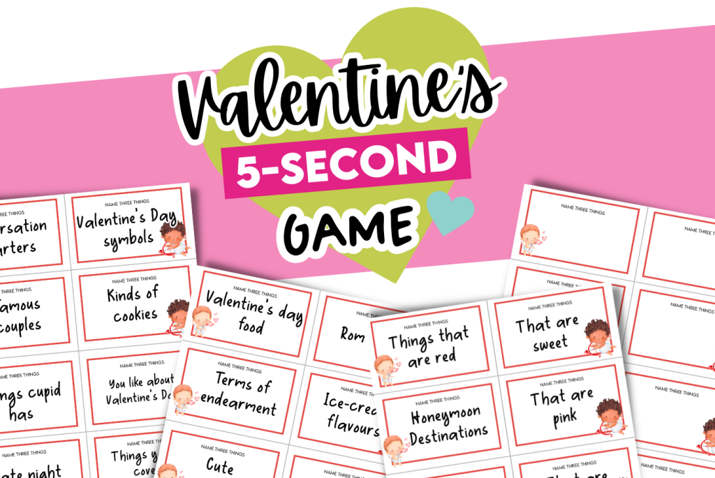 - Choose one player to read out the card, while another has to name three Valentine’s Day–related things by answering the question that is written on the card.