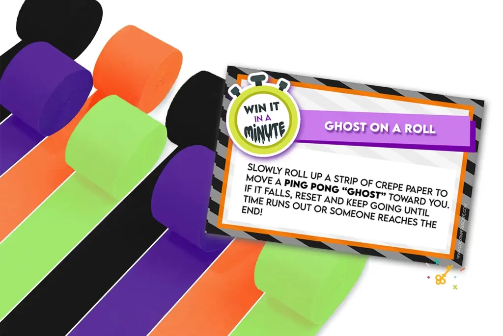 This one looks super simple until you start playing. Give each player a long strip of crepe paper laid out across the length of the table, and pop a ping pong ball (aka your tiny ghost) at one end.