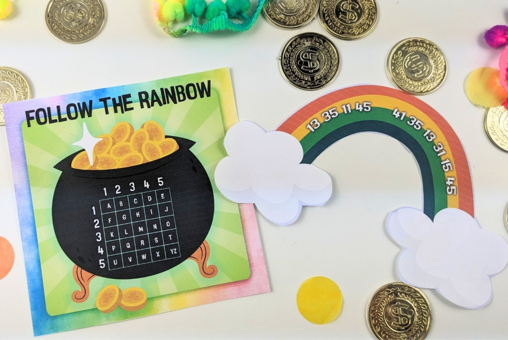 I love this next puzzle. A Polybius square is a simple grid is used to turn letters into pairs of numbers. In this game, players start with the image of the black pot of gold, which shows the Polybius square. They then use that grid to decode the letter pairs hidden in the rainbow image.