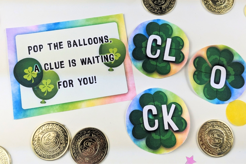 For this clue, hide the shamrock discs inside balloons, and mix in a few empty ones as decoys. Players pop the balloons to find their next location. If popping balloons isn’t a good fit for your group, you can simply tie the clues to the balloons instead, or skip this particular activity altogether.